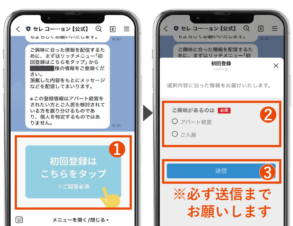 ③「初回登録はこちらをタップ」から、ご興味に応じて「アパート経営」⼜は「ご⼊居」のいずれかを選択し、「送信」をタップ